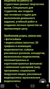 • видеосъёмка (монтаж; 3D графика и анимация; видеовизитки; съёмки рекламных роликов, концертов, музыкальных видеоклипов, полнометражных и короткометражных фильмов)