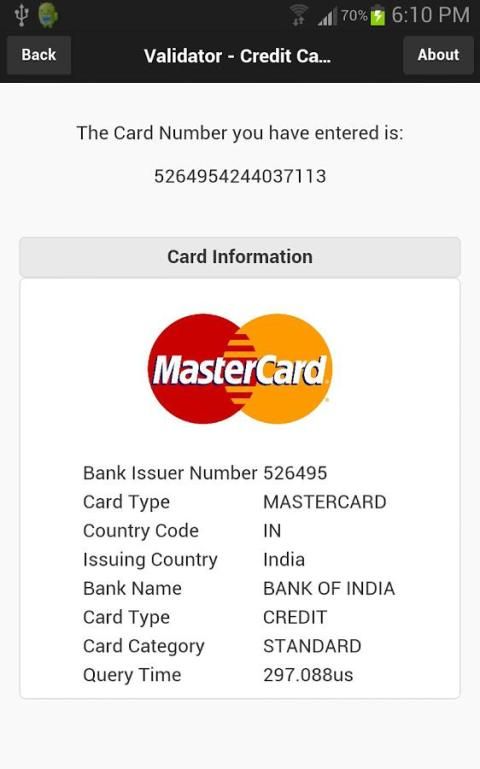 Это приложение может выявить некоторые информацию на карту, таких как банк-эмитент, выпуская страну,