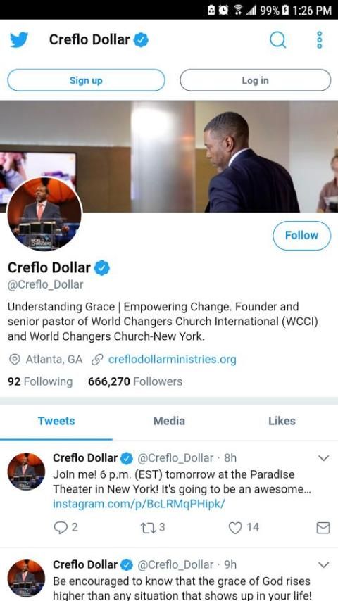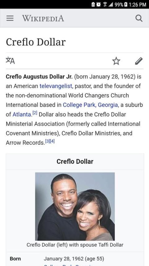 Крефло доллар основатель и старший пастор Всемирной Сменщики Церкви International (WCCI) в Колледж-Парк, штат Джорджия, который обслуживает около 30 000 членов; Мир Changers Церковь Нью-Йорк, в котором находится более 6000 молящихся каждую неделю; и множество спутниковых церквей, расположенных в Лос-Анджелесе, штат Калифорния; Индианаполис, штат Индиана; Вашингтон.; Цинциннати, Огайо; Кливленд, Огайо; Даллас и Хьюстон, штат Техас; и Кэрроллтон, Norcross, Макон, и Мариетта, Джорджия. В соответствии с поручением Бога, цель Creflo доллара заключается в создании 500 спутниковых церквей по всему миру. С 30 лет в служении, Крефло доллар стремится приносить благую весть Иисуса Христа для людей во всем мире, буквально изменяя мир одного человека за один раз.