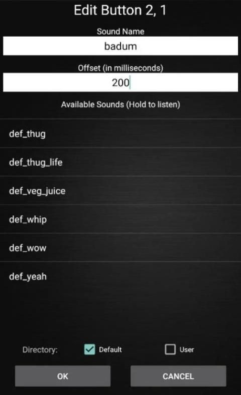 Режим редактирования - указывается в зеленой кнопке контуре. Нажмите любую кнопку для редактирования в новом окне. Выберите каталог в нижней части экрана, выберите звук, смещение и имя. После того, как смещение вводятся каждый звук можно предварительно прослушать с Введенным смещением (отрегулировать смещение для желаемого результата).