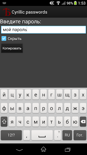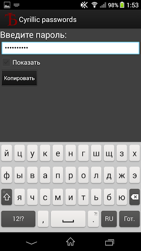 Приложение позволяет набрать пароль в русской раскладке, а затем скопировать в буфер обмена латинские символы соответствующие русским клавишам QWERTY клавиатуры.