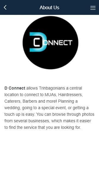 D Connect является центральным местом для Trinbagonians, чтобы найти услугу, ищут. Связь с MUAS, парикмахеров, нейл Techs и многое другое. Просмотр фотографий их работы и подключение к их социальных медиа!