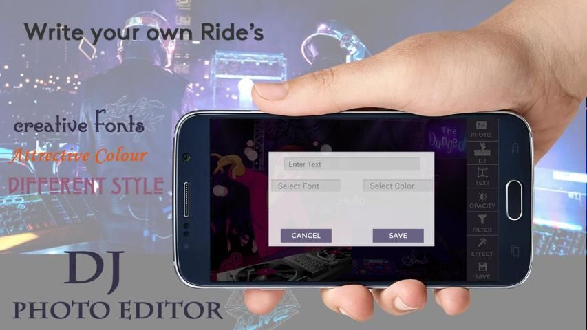 Добавить текст в творении. DJ Photo Editor также предоставляет вам текст полный функциональный редактор. Добавить текст на изображении. Изменить цвет текста, стиль текста шрифт и многое другое. Сделайте ваш DJ фото более привлекательным.