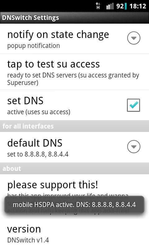 * Если DNSwitch не работает, вы должны опубликовать отчет об ошибке, чтобы андроид разработчика ROM. Ведение меня в курсе таких MOD проблем с DNSwitch очень приветствуется, конечно. Пожалуйста, всегда называют устройство и ПЗУ / MOD версии и поставщика при обращении в меня. Также провайдеры, кажется, возиться с DNS ... говорю это может помочь другим!