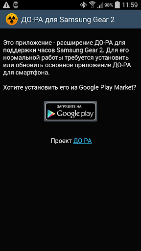 Это приложение - расширение ДО-РА для часов Samsung Gear 2. Вы сможете следить за текущим уровнем радиации и соответствием нормам радиационной безопасности.