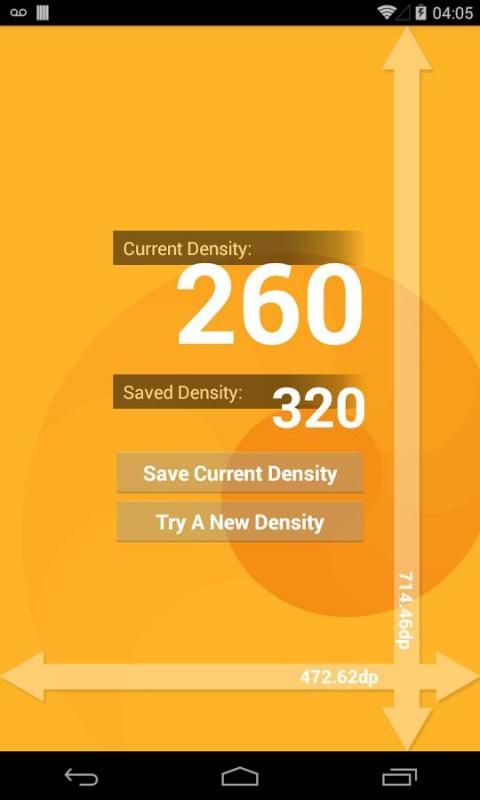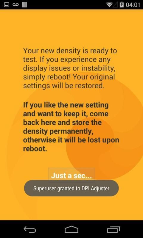 Введите новый плотность, перезагрузка, чтобы проверить его, и если вам нравятся результаты, вернуться в приложение и сохранить его навсегда. Если вам не нравится плотность, или что-то сбои, просто перезагрузите устройство для восстановления исходных настроек.