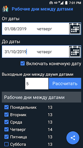 ► Подсчитайте, сколько рабочих и нерабочих дней между двумя датами.