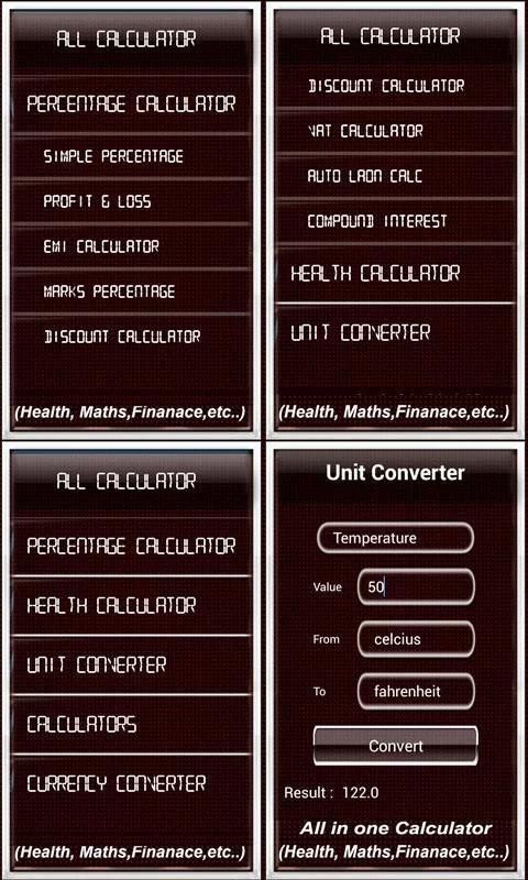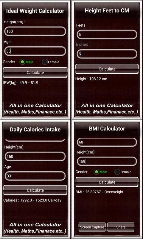 Повседневное Калькулятор App будет поддерживать 35 различных типов расчетов, как Процент, здравоохранения, Научный калькулятор, конвертер валют, Volume расчета, единицы Converted типов. Это использование калькулятора все в один инструмент для повседневной деятельности. У вас есть возможность сохранить экран калькулятора, а также разделить опцион на акции calculation.And также выбор для браузера сохраненных расчетов.