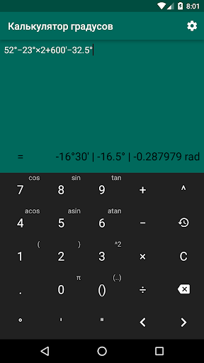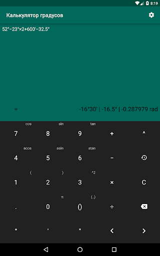 Хорошее приложение, но можно немного улучшить удобство пользования. Во-первых, сделать белый фон чтобы было отчётливее видно числа, либо сделать текст белым. Во-вторых, перевернуть кнопки с цифрами, чтобы 1 2 3 были сверху либо добавить возможность менять их ориентацию. В-третьих, кнопки с градусами, минутами и секундами стоит поместить над цифрами. В-четвёртых, готов поспорить, что никому не нужен виброотклик в калькуляторе, и тем более не нужен включённым по умолчанию.