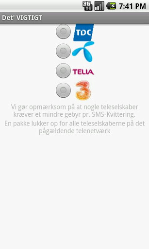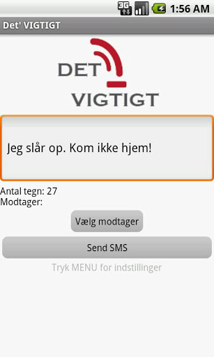Til forskel fra den indbyggede funktion "Leveringsrapporter", tjekker denne app om SMS'en blev leveret til modtageren og ikke telenetværket. Det kan nemt forveksles, da den indbyggede funktion kan skrive leveret, selvom mobilen er slukket og det går Det' VIGTIGT℠ i krig mod. Det' VIGTIGT℠ for æller når SMS'en faktisk er hentet ned på mobilen eller hvis mobilen f.eks. er slukket.Samtidig får du mulighed for at få præcise tidspunkter for modtagelse - helt ned til sekunder og du får muligheden for at gemme kvitteringer, så du har beviser på modtagelse.Den er god i situationer, hvor det er vigtigt at vide om SMS'en er nået frem. Det kan f.eks. være "SMS'er til sælgere på Den blå avis eller ebay quot;, som en af vores brugere siger. Det kan også være nyttigt i konkurrencer eller bare en vigtigt SMS som "Jeg slår op" eller "Jeg kommer 30 minutter for sent til mødet".... og du har selvfølgelig mulighed for at undgå modtagelsen af SMS-kvitteringen, ved at benytte din normale SMS-app. Det er kun SMS'er afsendt via Det' VIGTIGT℠, der melder tilbage om modtagelsen.Hvis du har spørgsmål eller idéer, kan du kontakte mig på http://frax.dk eller app'ens facebookside.https://www.facebook com/DetVIGTIGTApp'en er testet virkende af en 3repræsentant.Presseomtale:FavrskovPosten ( http://bit.ly/tpnFxT ) - 19. novemberMobilTjek.dk ( http://bit.ly/sVDHZO ) - 20. novemberLokalavisen HINNERUP ( http://bit.ly/u9YKvm ) - 22. novemberAarhus Stiftstidende ( http://bit.ly/uqvc5q ) - 25. novemberRanders Amtsavis ( http://bit.ly/uV6LBq ) 25. novemberUnderstøttede netværk:Telia ✓3 ✓TDC ✓