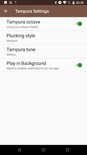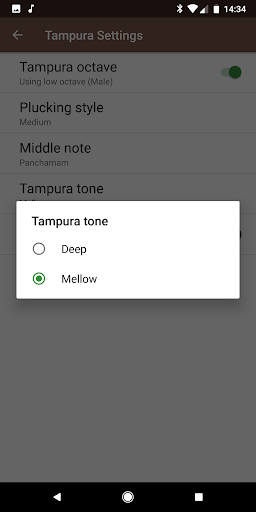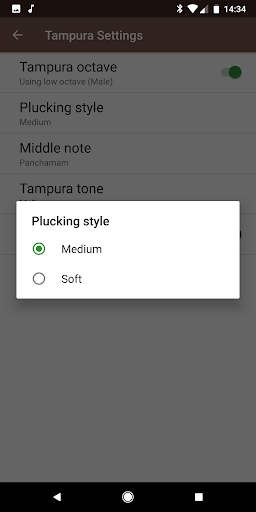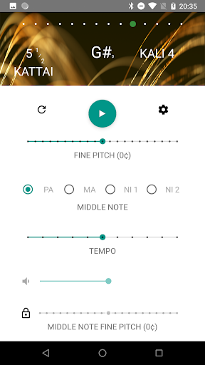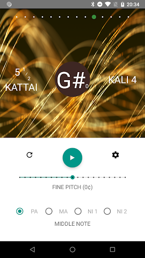 Прокрутите влево или вправо, чтобы выбрать различные настройки шага.В настройках используйте разные типы Tanpura (Mellow vs Deep), разные стили ощущения (мягкий против среды), разные средние ноты (PA, MA, Ni 1, Ni 2).Чтобы точно настроить, вы можете точно настроить шаг с разрешением 10 центов, а также независимо от тонкой настройки шага для PA / MA / NI.Вы также можете изменить темп струнного срыва и настроить глобальный объем или уменьшить объем PA / MA / NI по сравнению с глобальным томом.В то время как это играет на заднем плане.
