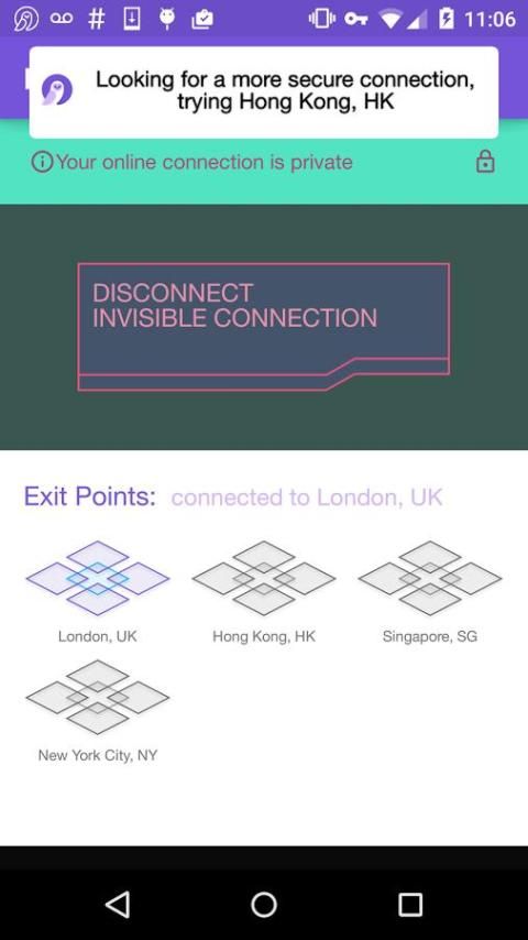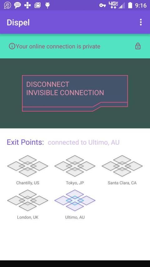 Простота в использовании : В отличие от других конфиденциальности / анонимности решения, которые требуют обширной конфигурации, Android пользователи смогут включить конфиденциальности для мобильных устройств для Dispel показывает просто нажав зеленую кнопку. После активации, маленький, знаковой сова Dispel будет отображаться в строке состояния, давая понять, что программа работает в фоновом режиме.
