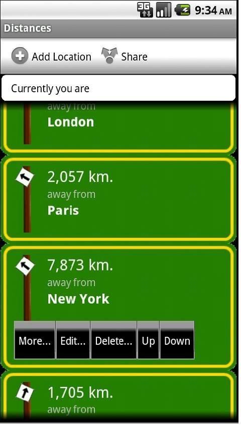 How far you are from SF right now? Or Paris? Or NY? Distances can tell you that. Distances for Android is a simple application that uses your current location to determine how far you are from certain points of interest. It allows you to add your own landmarks and to fully customize the app. You *can* switch Miles <-> Kilometers in the Settings.