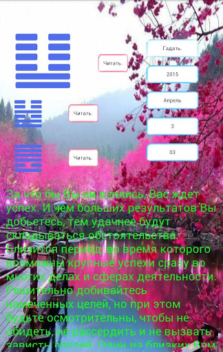 Гадание по дате на Будущее один из современных вариантов гадания по книге перемен "И Цзин".Вам нужно ввести время и дату предстоящего события и Ваше устройство с помощью сложного древнекитайского алгоритма вычислит возможные варианты развития событий.