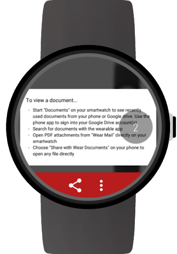 - Открыть приложение PDF из нашей «Почта для Android Wearn», непосредственно на вашем SmartWatch - Выберите «Поделиться с документами износа» на вашем телефоне, чтобы открыть любой файл напрямую