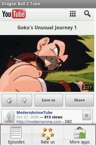 "DragonBallZTube Free" is collection of popular Japanese Dragon Ball Z ((ドラゴンボールZ(ゼット) Doragon Bōru Zetto?) anime cartoon series videos posted on Youtube ever. Contains all episodes of Dragan Ball Z posted on YouTube. New Feature: Lets you see videos in Low bandwidth/High Bandwidth mode through option menu. Contains all 9 sessions: Saiyan Saga, Namek and Captain Ginyu Sagas, Frieza Saga, Garlic Jr,Trunks, and Android Sagas, Imperfect Cell and Perfect Cell Saga, Cell Games Saga, Great Saiyaman and World Tournament Sagas, Babidi and Majin Buu Sagas, Fusion and Kid Buu Saga Keywords: Kids, animation, entertainment, fun, Goku ,Bulma ,Krillin ,Piccolo ,Gohan ,Vegeta ,Trunks ,Frieza ,Cell , Majin Buu Kids love it!! so take a break and enjoy watching cartoon videos with your kids :) **************** It is a Free Version. Please have a look on Full Version Highlights: Better video quality, NO Ads, See full screen videos. See videos in Landscape mode for better viewing experience!! Your feedbacks are welcomed!! **************** Disclaimer:This app only provide the easy way accessing Youtube links, It doesn't own any video posted on Youtube.