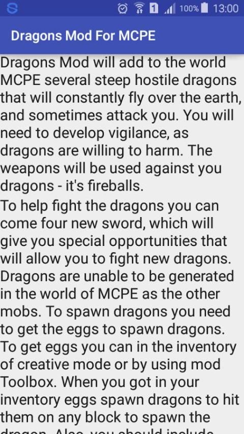 Для того, чтобы помочь бороться с драконами вы можете прийти четыре новых меча, который даст вам специальные возможности, которые позволят вам сражаться с новыми драконов. Драконы не могут быть сгенерированы в мире MCPE, как и другие мобы. Чтобы вызвать драконов вы должны получить яйца икру драконов. Чтобы получить яйца вы можете в инвентаре творческого режиме или с помощью мод Toolbox. Когда вы получили в вашем инвентаре яйца икру драконов, чтобы поразить их на любом блоке, чтобы породить дракона. Кроме того, вы должны включать в себя сложность. Если вы икру в то время включают в себя сложность, а затем выключить, а затем драконы исчезнут в секунду. Кроме того, мод включает в себя возможность оседлать дракона и прикрепляется к нему с четырьмя новым мечом сражаться с драконами.