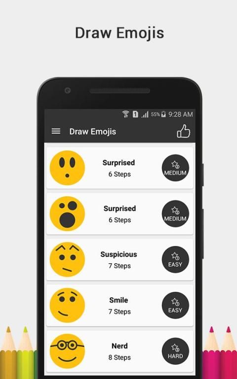 В простых шага позволяют выполнять фантастические рисунки, просто возьмите бумагу и карандаш, выбрать Emojis вам нравится, и следовать шаг за шагом инструкции. Он очень прост в использовании.