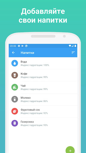 Чай, кофе, сок и т.д. Добавляйте любимые напитки и их индексы гидратации для верного подсчета насыщения водой.