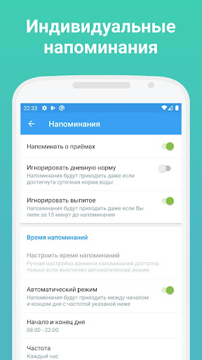 Можно включить автоматические и задать ручные настройки времени, когда должны приходить напоминание пить воду.