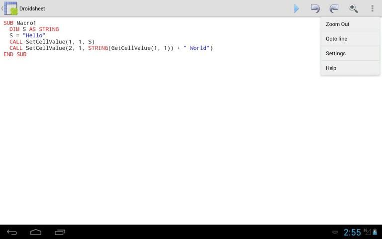 Droidsheet также включает в себя мощный Macro язык программирования, который может быть использован для выполнения более сложных вычислений. Этот макрос среда программирования базируется на структурированном диалекта BASIC, который включает в себя десять типов данных (булево, BYTE, SHORT, Integer, Long, Float, распашные, СЛОЖНЫХ, струнный и VARIANT) вместе с целым рядом функций, включая математическую, обработка строк, время и дата, тип проверки, преобразование типов, а самое главное, некоторые для манипулирования значениями ячейки электронной таблицы.