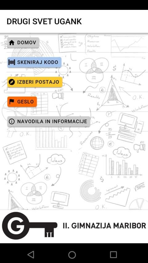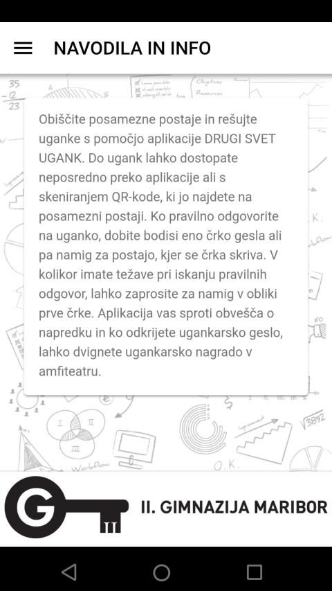 S pomočjo aplikacije DRUGI SVET UGANK, lahko na informativnem dnevu II. gimnazije Maribor, vodeno obiščite postaje, ki predstavljajo različne aktivnosti. Do ugank lahko dostopate neposredno preko aplikacije ali s skeniranjem QR-kode, ki jo najdete na posamezni postaji. Ko pravilno odgovorite na uganko, dobite bodisi eno črko gesla ali pa namig za postajo, kjer se črka skriva. V kolikor imate težave pri iskanju pravilnih odgovor, lahko zaprosite za namig v obliki prve črke. Aplikacija vas sproti obvešča o napredku in ko odkrijete ugankarsko geslo, lahko dvignete ugankarsko nagrado v amfiteatru.