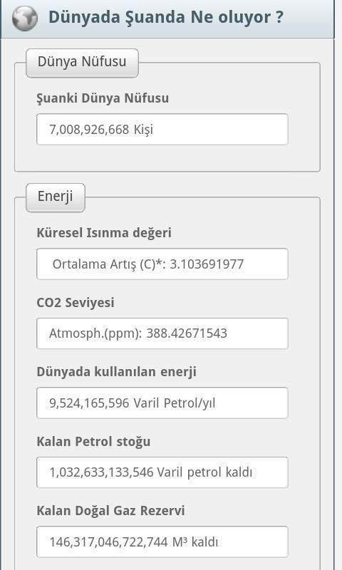 Şuanda dünyada kaç kişiyiz merak ediyor musunuz ? Bu sorunun ve ilginizi çekecek bir çok ilginç veriler bu uygulamada sizleri bekliyor. Küresel ısınma sizce ne durumda ? Ne kadar petrol stoğumuz kaldı dersiniz ? Ya doğalgaz ? Aids virüsü ne kadar hızlı yayılıyor öğrenmek ister misiniz ? Peki nelere sahibizde farkında değiliz bunlarıda öğrenmek ister misiniz ? Hepsi ve daha fazlası Dünya Nufusu uygulamasında sizleri bekliyor. keywords: dunya nufusu,dünya nüfusu, world population, world counter,