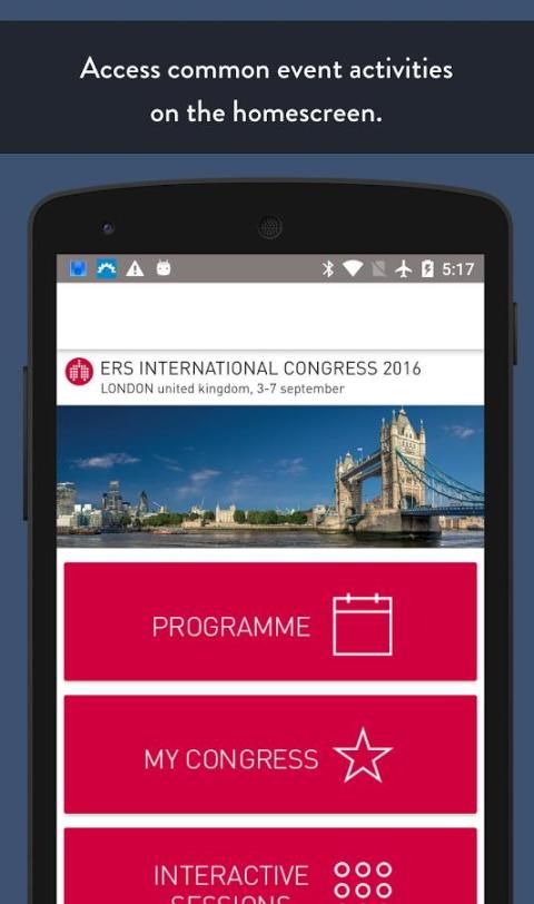 Официальное приложение Конгресс является бесплатным для загрузки и позволяет делегатам искать программу по дням, факультета, темы, целевой аудитории и дорожки. Он обеспечивает доступ к авторефератов, ePosters и веб-трансляции записанных презентаций через пару часов после сессии имели место. Есть также полные списки отраслевых мероприятий, выставочного плана, интерактивной карты и персональной повестки дня. Делегаты съезда также имеют возможность настроить свои профили появляться в списках активных участников, что позволяет делегатам обратиться к другим видимым пользователям и обмен электронными визитными карточками.