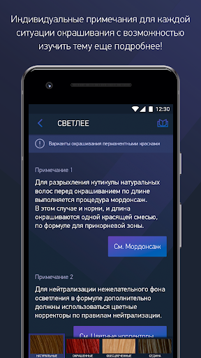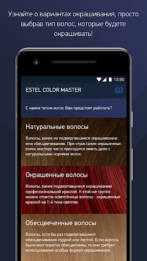 Удобное построение информации в приложении по колористике для парикмахеров ESTEL Color Master позволит Вам легко разобраться как можно получить желаемый цвет волос, с помощью каких красок, на какие детали стоит обратить внимание, нужно ли добавлять цветные корректоры и сколько, посмотреть разные примеры.