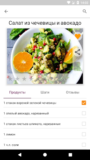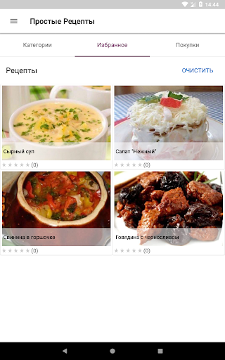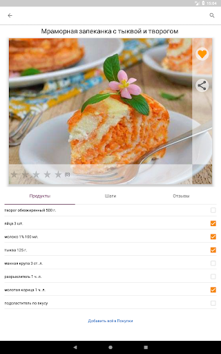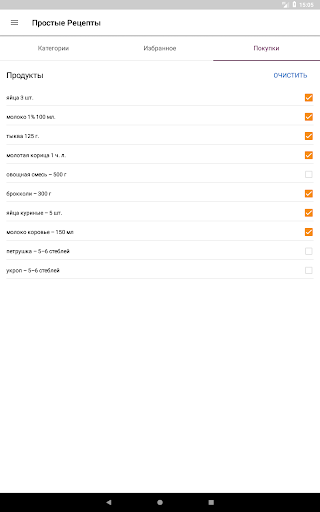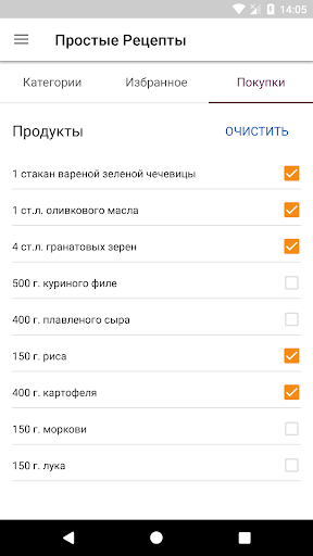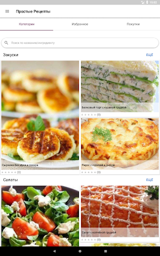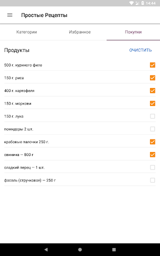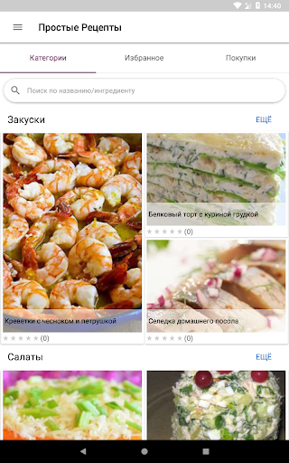- раздел Покупки – просто добавляйте продукты из рецепта и пользуйтесь списком для покупок при походе в магазин. Приложение работает оффлайн, список продуктов для покупки всегда будет с Вами