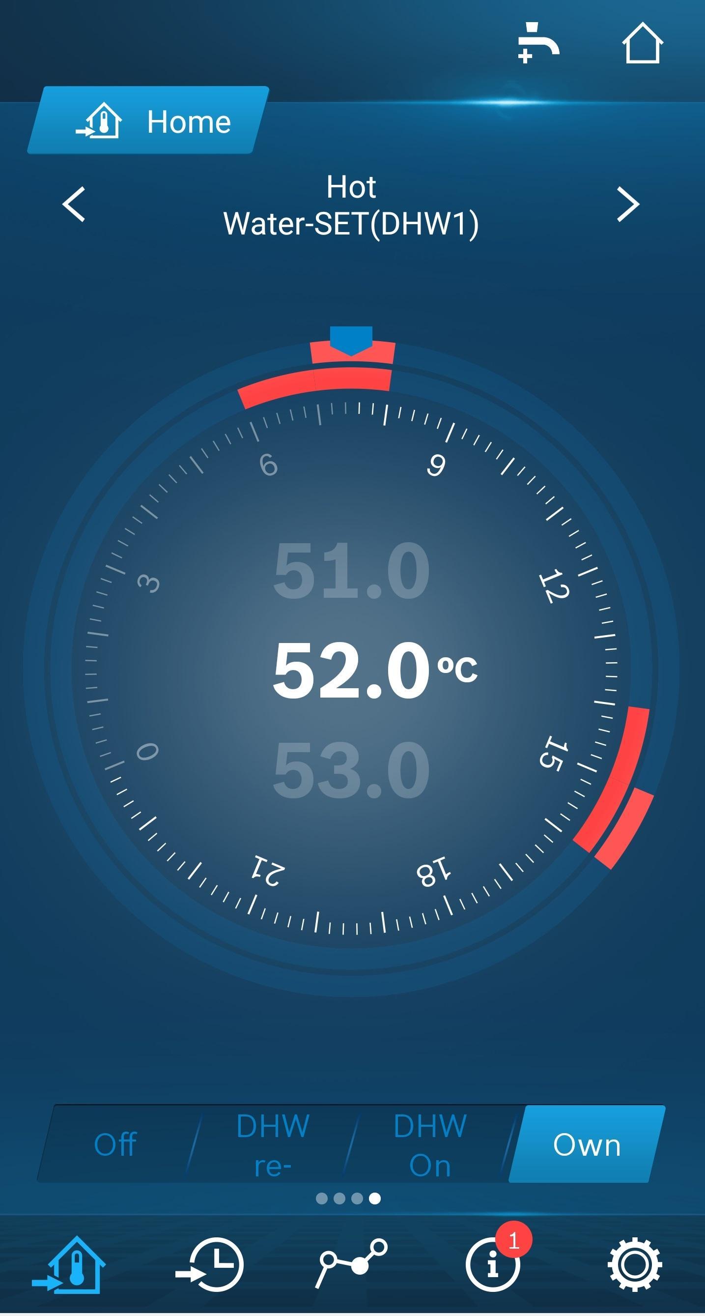 New function "Once-only cyl charging" if you need hot water outside the set times. The symbol (tap with plus sign) for the "Once-only cyl charging" function can be found at the top right of the hot water home screen.