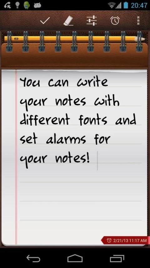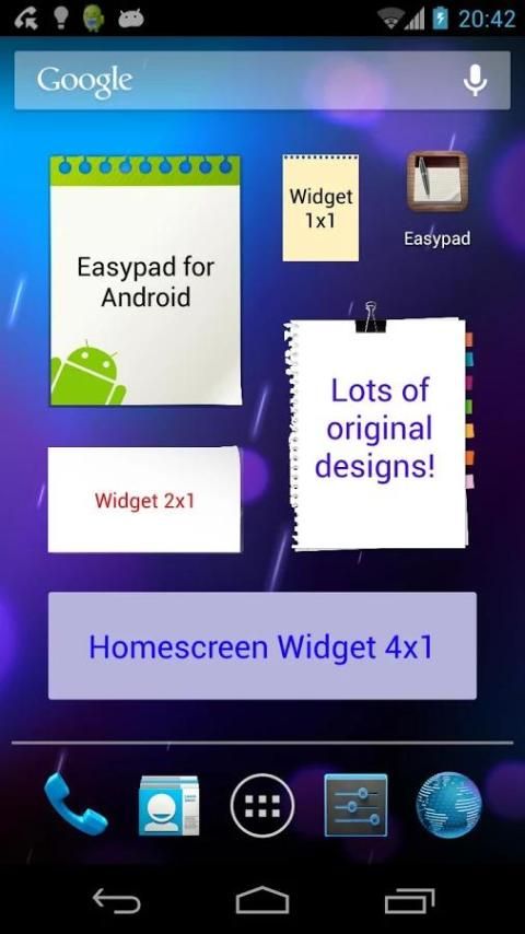 Написать и организовать ваши идеи в любое время. Быстрая и простая в использовании! Нужна удобная блокнота всегда с вами? Вы хотите, чтобы написать ваши встречи во время разговора с телефоном? Что о том, липкие заметки в телефоне рабочем столе? Easypad поможет вам организовать ваши идеи в простой и быстрый способ с тонны приятных особенностей: - Быстрый и простой в использовании - Написать столько страниц, сколько вы хотите, сохранить все ваши идеи в одном блокнота - Копировать, вырезать и вставлять - Изменение цвета текста - Создание заметок с помощью и существующего в качестве шаблона - Изменение конфигурации заметки в любое время - 9 эксклюзивных конструкций высокого качества - Отправьте свои заметки по SMS, электронной почте или даже к вашему Dropbox :) - Резервное копирование заметки, отправляя их на вашу электронную почту - 3 размера шрифта: малые, средние и большие (4 в PRO версии) - 8 различных размеров виджетов: 1x1 (S), 2х1, 2х2 (М), 3x2, 3x3 (L), 4x2, 4x4 (XL), 5x5 - Добавление ярлыка в панели уведомлений, чтобы получить быстрый доступ ко всем заметкам