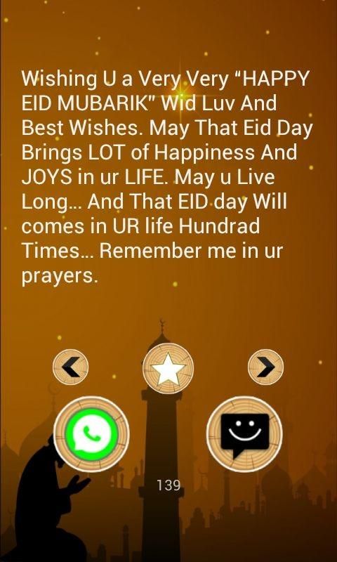 Happy Eid Mubarak SMS and Quotes 2014 Eid ul-Fitr, Eid al-Fitr, Id-ul-Fitr, or Id al-Fitr, often abbreviated to Eid, is a Muslim holiday that marks the end of Ramadan, the Islamic holy month of fasting (sawm). Eid is an Arabic word meaning "festivity," while Fiṭr means "breaking (the fast)". Eid is symbol of love & holiness. It is very good theme with nice feature, just get new experience. This app have more then 100 message for Eid 2014 that you can send to your loved ones across globe and wish them Eid Mubarak. The Best way to remember our loved ones on this auspicious occasion. Download this app and greet your friends so that they can remember you in there prayers and also to let them know that you remember them in your prayer. Features - Easy to use - Send SMS at WhatsApp - Send SMS to your hangout friends - Send SMS to your contact - Can set Favorites. - You can edit message before sending Happy Eid 2014 to everyone