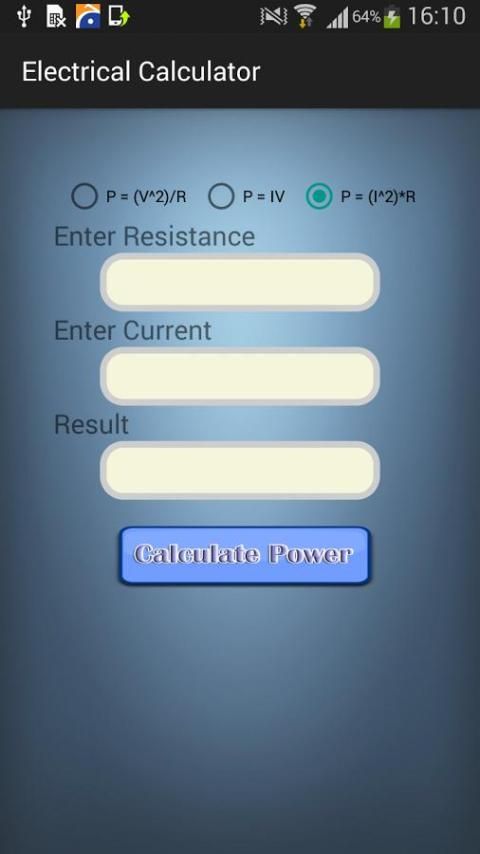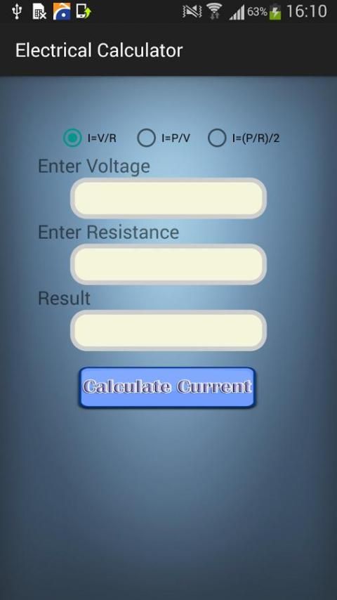 Первый экран «Электрические Калькулятор" содержит 4 варианта из которых каждая состоит из дальнейших суб трех формул. Просто введите значения соответствующей формулы, и вы сделали.