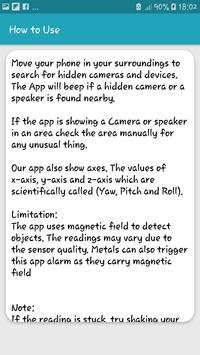 Hidden Camera Detector and locator protects you from spy bug detector. This app also detect metal from 15cm. It works best while detecting magnetic field. It does not detect aluminium, it just detect hidden camera.