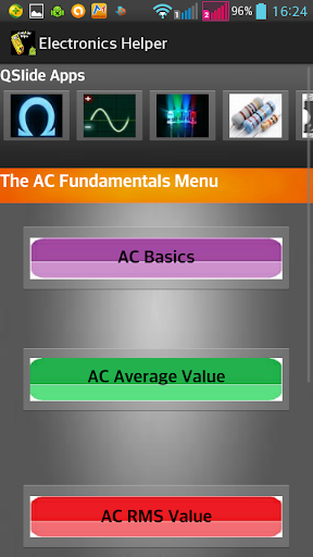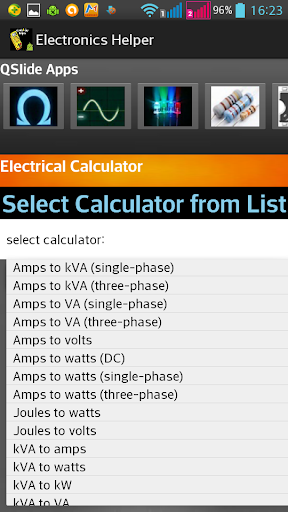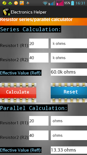 The purpose of developing this app is to provide ease to the users while doing tedious and complex calculations of electronics. Almost all electronics calculations can be performed by it(for instance,this app includes basic "ohm's law calculator" to "resistor and capacitor series/parallel calculator", "555 timer generator calculator" to "electricity and energy consumption calculator",and many more). Overall 14 sub apps are inside it. Moreover it has more than 35 calculators inside a single sub app i.e. "electrical calculator" (which is one out of the 14 sub app of this main app).