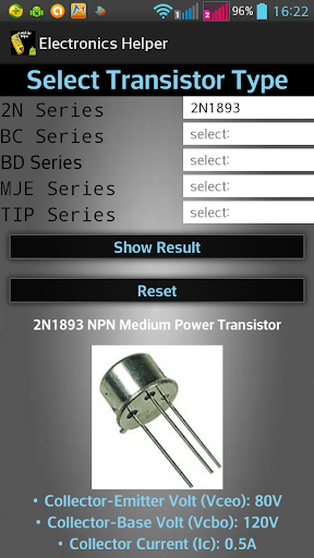 It also includes "resistor color code calculator app" along with almost all transistors and diodes series specifications.