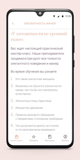 Сборник практических курсов Австрийской Высшей Школы этикета, который за короткое время помогает приобрести привычки и манеры истиной леди. Все курсы разбиты по разным сферам жизни и граням элегантности. Выбирайте тот, который сейчас наиболее актуален для Вас! Каждый день Вы получаете новый урок и новое задание от преподавателя. Пройдите все уроки и выполните все задания, чтобы превратиться из просто красивой женщины – в элегантную!