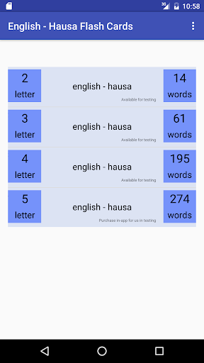 Tiny App, которое поможет вам вместе с изучением основателей Хауса.Содержащие 1, 2, 3, 4 и 5 букв английских словами, переведенные в Hausa.Также доступны поисковые принадлежности (бесплатно), режим переключения (бесплатно) для карт Randerize, а также тестовый режим (в приложении, оплаченном).
