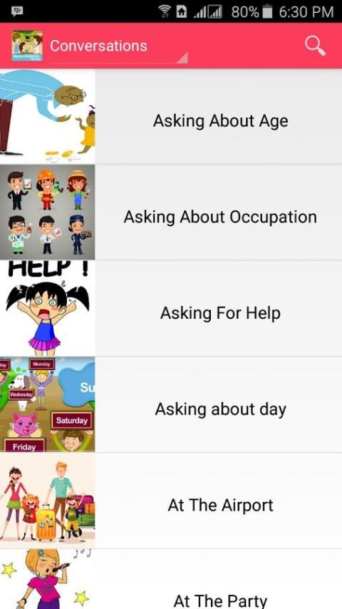 Это приложение содержит различные примеры ежедневного диалоги на английском языке. Очень хорошо подходит для тех, кто хочет научиться говорить по-английски. Дети могут практиковать английский язык с хорошими темами и реальной жизни.