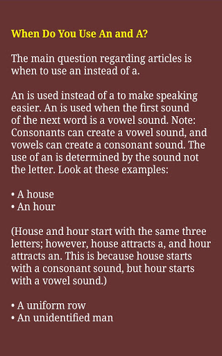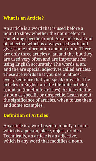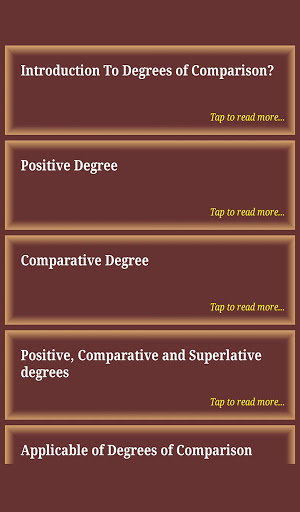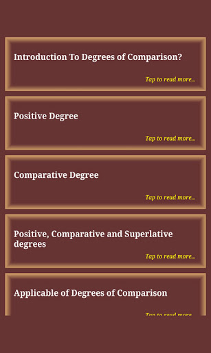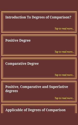 Английский - один из самых широко распространенных языков в мире, поэтому неудивительно, что так много людей хотят научиться говорить по -английски.Это приложение содержит грамматические правила с подходящими и простыми примерами, которые заставит вас легко учиться на своем мобильном телефоне, поскольку он работает без подключения к Интернету.Вы можете практиковать его в любое время.Здесь мы облегчаем вам изучение английской грамматики.В этом приложении мы классифицируем грамматику на различные темы, и каждая тема содержит лучшие примеры, которые можно легко понять.Это часть II, которая является продолжением части-I.Мы будем обновлять часть III очень скоро.Так что возьмите приложение в своем Android Mobile и сделайте умнее, чтобы произвести впечатление на своих друзей, близких и дорогих, улучшив свою английскую грамматику.