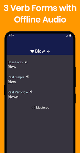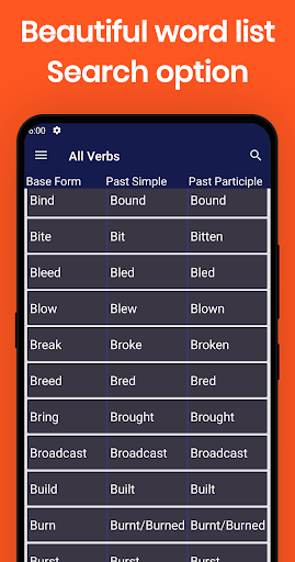 Irregular Verbs English show 3 forms of Verbs.You can listen to pronunciation of the verbs as well as mark a verb as favorite.