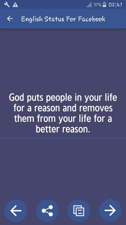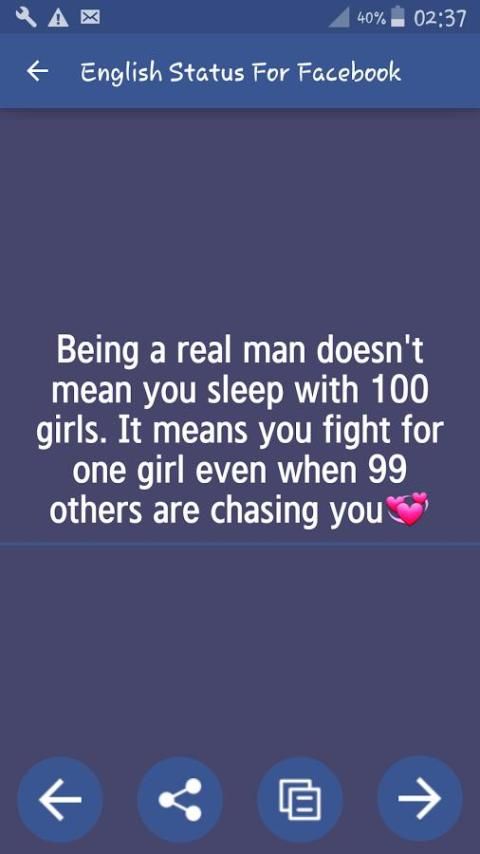 English Status For Facebook Is app give you Best Facebook status and Helps you To stay in Touch with Your family and friends , and its give You a great collection of Status and quotes Make You Smile And miss and Love , Use it To motivate Peaples around You Be Differnt and Share Peace And Love. Don't Forget Rate Our app If You Like it ^^ _______________________________________________________________ ADVANTAGES: [✔] Easy To Use. [✔] You Can Copy The Status On Any social Like Whatsapp, Facebook, Instagram, Twitter, Telegram [✔] Work Without Internet [✔] Monthly New Update Status. [✔] Smart & User Friendly Interface. [✔] Collection Of Quotes And Status _______________________________________________________________ Available Status : ★ Motivate status ★ Sweet Status ★ Break Up Status ★ Crazy Status ★ Friends Status ★ smile status ★ Nice Status ★ Peace Status ★ Love Status ★ live Status ★ Status Quotes ★ Engagement Status ★ Other Status