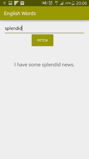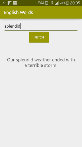 This app shows usage of the word that you entered in a sentence by referring to different resources. If you want to see different examples you can click the FETCH button over and over.