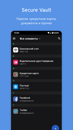 Воспользуйтесь Enpass, чтобы надежно управлять всеми данными в одном месте. И что лучше всего — ваши данные Enpass не хранятся на наших серверах. Напротив, они хранятся локально на вашем устройстве и могут быть синхронизированы при помощи предпочитаемого надежного облака. Все в зашифрованном виде!!