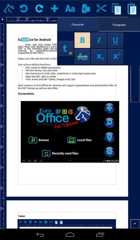 EuroOffice для Tablet построен на Qt и Calligra код, оптимизированный для планшетов, но он также может быть использован на более сильных смартфонов.