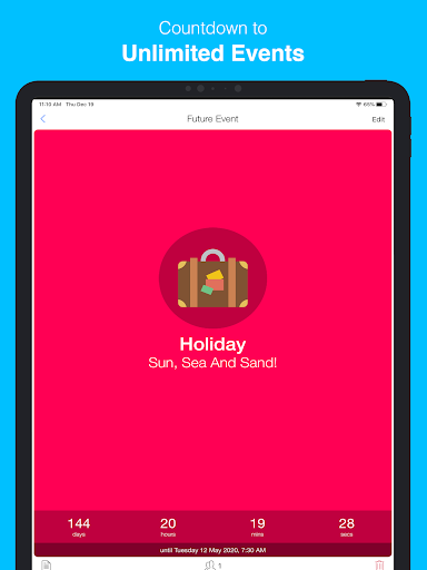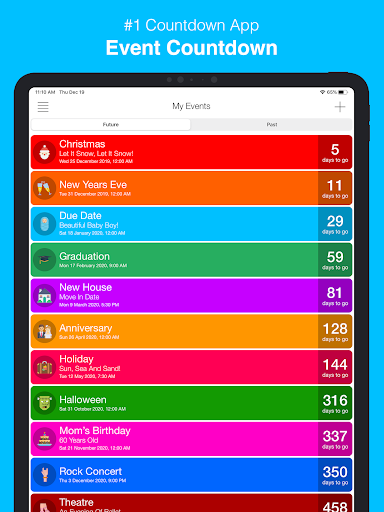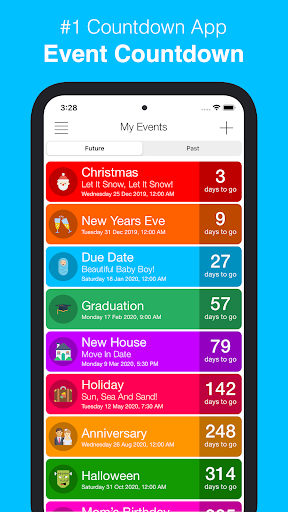 Обратный отсчет до важных дней, дат и событий в вашей жизни.День рождения, праздник, вечеринка, День Благодарения, Рождество, Хэллоуин, Валентинки, Свадьба, годовщина, рождение, ребенок, выпускной, новый дом, спортивное матч, игра, фитнес -цели и amp;Голы, выход на пенсию, концерт, концерт, театр, телешоу, релиз фильма, список ведра и многое другое.Обратные отсчеты
