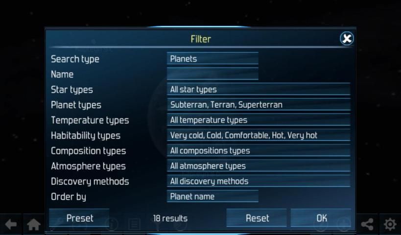 Exoplanet Explorer takes you on a journey into deep space, beyond the limits of our Solar System. Based on the latest available data, you'll explore virtual models of more than 700 known planets and the star systems that they inhabit. The data is sourced from The Exoplanet Encyclopaedia, SIMBAD, and scientific papers, and if it's not available from one of these sources, then wherever possible it will be calculated or estimated, giving you access to one of the most complete exoplanet databases. In addition to an intuitive interface which allows touch driven navigation through our Galaxy, Exoplanet Explorer also offers a comprehensive search tool which will let you find the planets and systems that you are interested in. This includes the ability to both search and sort by planet name, the number of planets in a system or even then number of stars in a system, to name just a few. Statistics are provided to summarise the information in the database and give you a global perspective. Planets have been divided up into 6 classes, and further subdivides into 3 temperature classes. This information has then been used to create models which are then assembled into working solar systems to give you an idea of what they might look like if we could travel there today. The full version of Exoplanet Explorer features automatic data updating whenever new planets are discovered, Hi-def graphics for tablets or large screen phones, advanced statistics, functions to help you compare our solar system to others, and no ads!