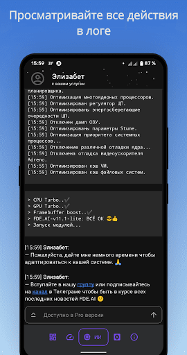 FDE.AI - максимально универсальный оптимизатор ОС Android. Захватываются самые разные аспекты настройки ОС и ядра Linux. При этом FDE.AI максимально кросс-платформен. Все осуществляется средствами ОС и ядра Linux. Программа настраивает множество параметров исходя из технической конфигурации устройства и применяет оптимальные настройки основываясь на такие факторы как ЦП (архитектура, частота, кол-во ядер), ОЗУ, ПЗУ (тип, размер), версия ОС и т.п. Все настройки применяются не-системно (не трогает системный раздел). Часть функционала программы может не поддерживаться различными процессорами, ядрами.
