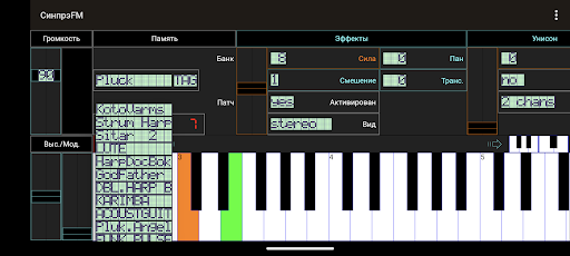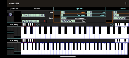 Во время проигрывания звука, вы можете использовать эффект вибрато управляя активными клавишами с помощью пальцев или переключая клавиатуру в различные октавы. Другие функциональные параметры доступны над клавиатурой, в том числе 2 вида портаменто, уровни чувствительности для определёния тона инструмента или модуляция громкости, и некоторые эффекты, которые дают ощущение глубины при использовании гарнитуры, особенно для щипковых звуков. Вы также можете настроить полифонию, чтобы адаптироваться к возможностям вашего устройства. Благодаря оптимизированному ключевому функционалу, вы можете услышать до 16 каналов играющих вместе, даже на устройствах среднего класса.